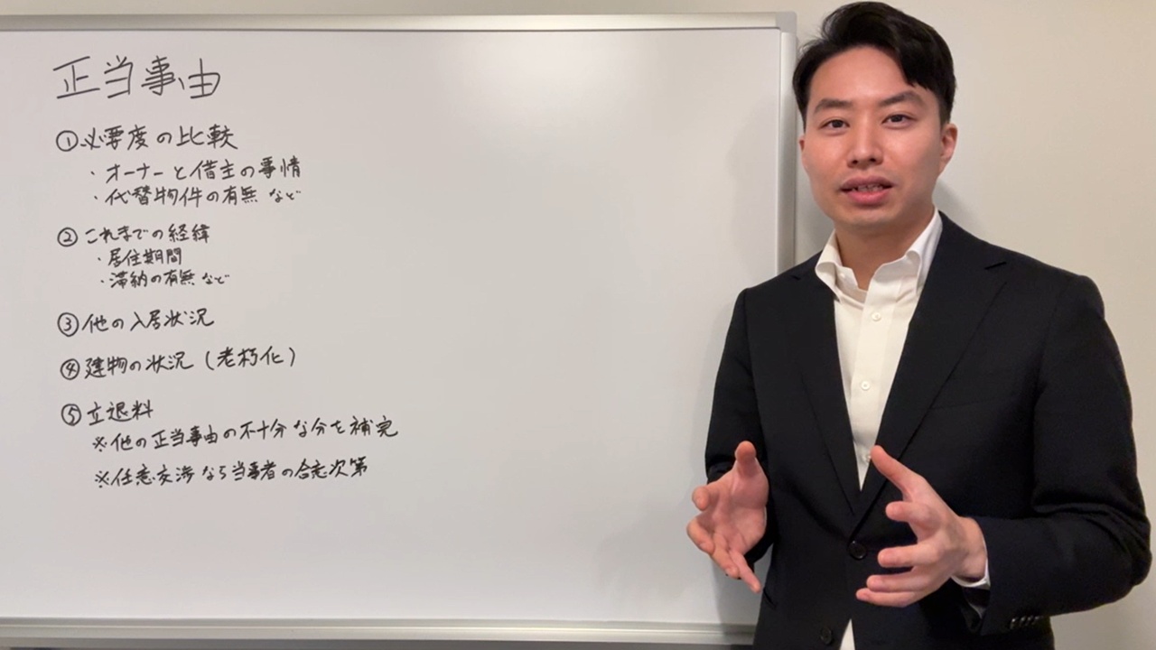 正当事由とは、オーナー側から更新拒絶をして退去を求める場合や、契約期間中であっても、オーナー側から解約・解除を申し出る場合に、借主に対して法的に適法な形で退去してもらうために必要となる要件です。